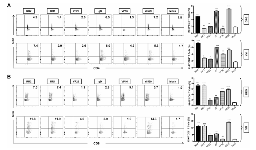 图4.五种基于腺病毒的候选疫苗对HSV-2感染豚鼠进行治疗性免疫后,其背根神经节和阴道黏膜中CD4+Ki-67 T细胞与CD8+Ki-67 T细胞频率增加