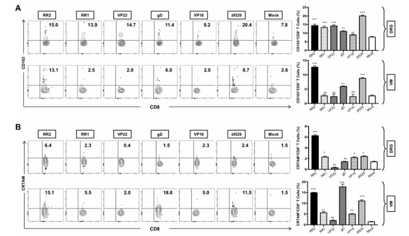 进一步分析显示,在DRG中,rAd-RR2、rAd-RR1、rAd-gD和rAd-VP22疫苗能显著提升CD8+CD103+组织驻留记忆T细胞的频率;但在VM中,仅rAd-RR2和rAd-gD表现出此效果。CD103作为驻留记忆标志蛋白,通过结合E-钙黏蛋白促进T细胞在上皮内滞留,从而在病毒再激活时触发快速局部免疫反应。rAd-RR2和rAd-gD诱导的CD103+ T细胞优势与其显著降低病毒脱落和病变严重度的保护功效相关。