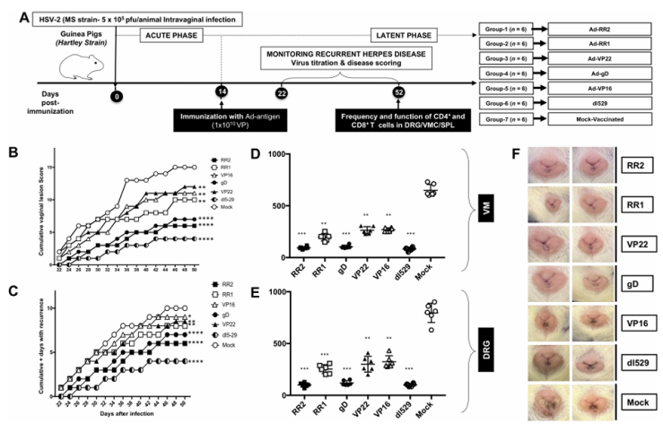 生殖器疱疹是一种由1型或2型单纯疱疹病毒引起的复发性、通常疼痛的性传播疾病。全球约有4.91亿49岁以下人群感染HSV-2,并且相对于男性,女性更容易感染HSV-2。为了应对这一疾病难题,科研界正持续探索新的防治策略。2025年3月,美国加州大学欧文分校医学院研究团队联合TechImmune, LLC公司在《Frontiers in Immunology》上发表了一篇关于在HSV-2潜伏感染豚鼠模型中,重组腺病毒疫苗rAd-RR2和rAd-gD能有效诱导背根神经节与阴道黏膜中高频率的IFN-γ+ CD4+/CD8+组织驻留记忆T细胞,显著降低病毒脱落及生殖器疱疹病变程度,从而防止疱疹复发的研究。
